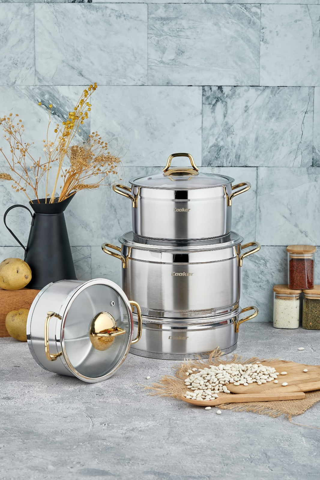 Elevate your culinary experience with this stunning 8 Piece Stainless Cookware Set with Gold Handles.