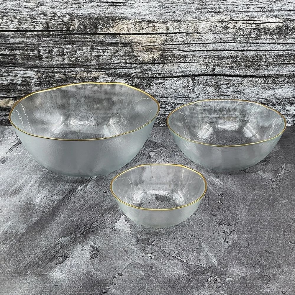 Expertly crafted, this set of 3 Bowls add a touch of elegance to any table setting. The unique hammered glass design and stunning gold trim make these bowls a rare find. Enjoy them for both their beauty and practicality.